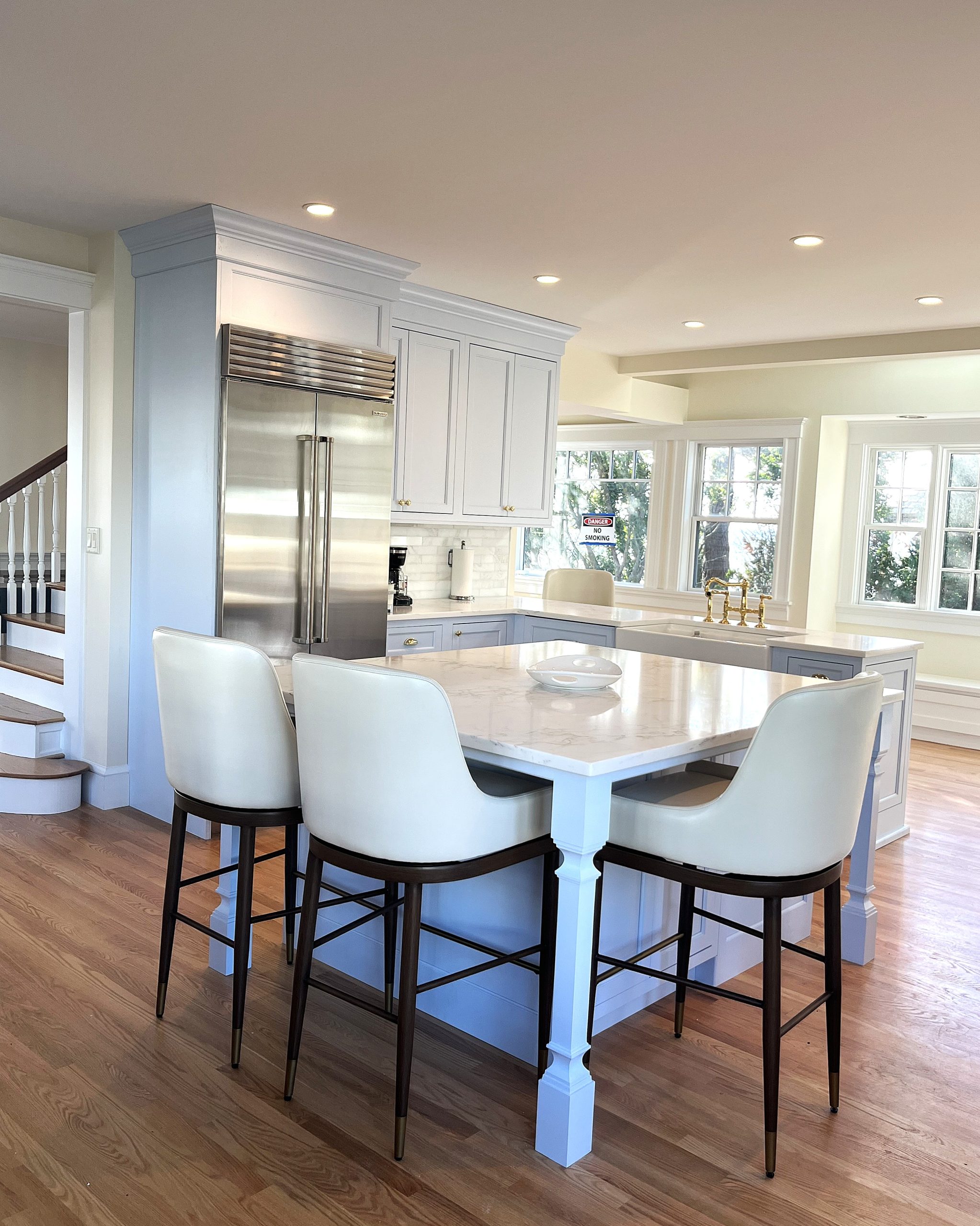 The homeowners wanted a large open kitchen designed for entertaining. This was a large project that including opening a wall and combining three rooms. We installed a new center beam downstairs to support the weight of the island! Cabinets are Brighton Inset shaker in low sheen white. The 12.5′ island was a amust- the granite is leathered River White. Sandwich, MA