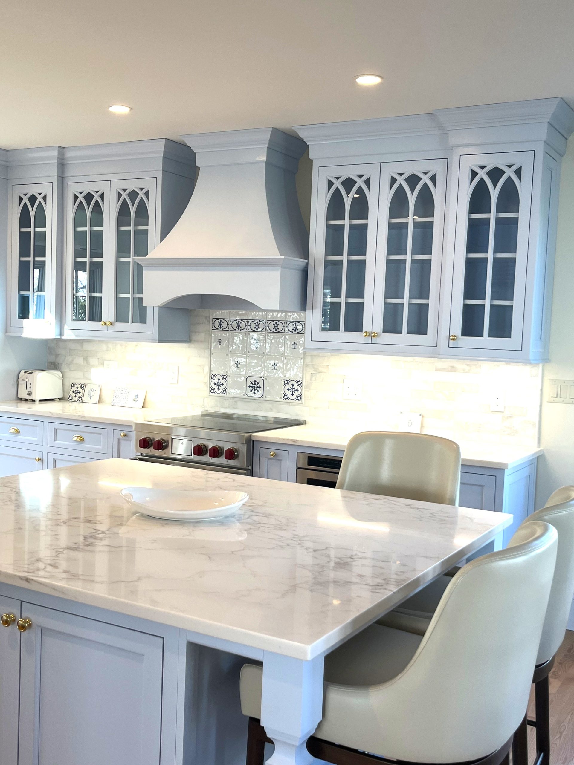 Classic North Shore kitchen. Quartz from MSI, cherry top, Cabico inset cabinetry and blue tile