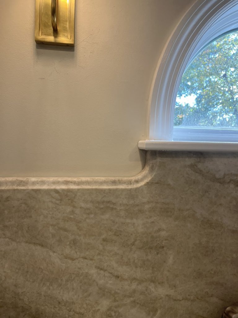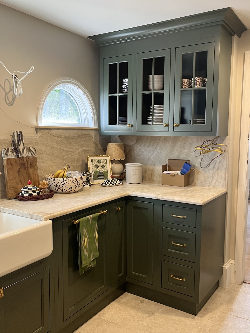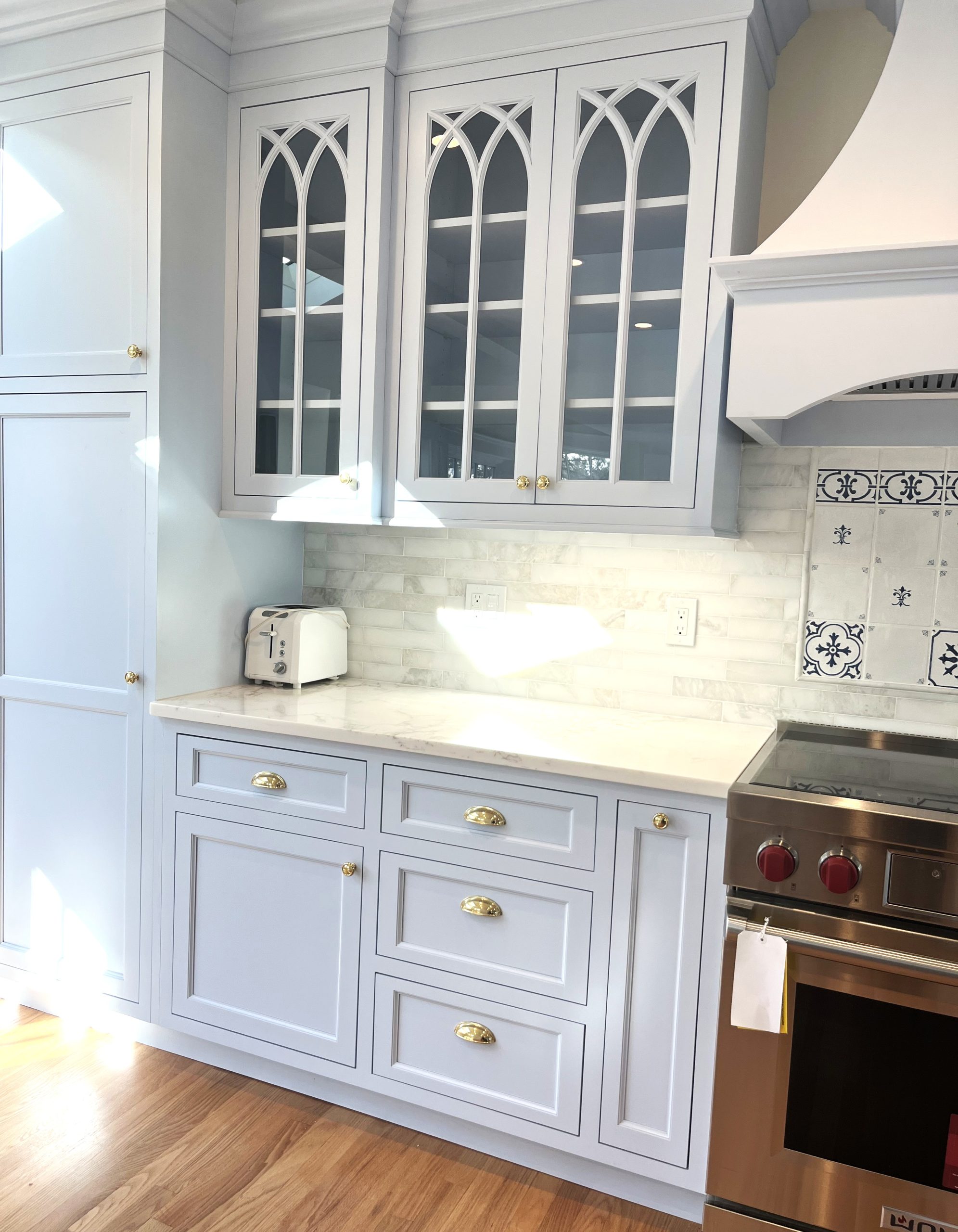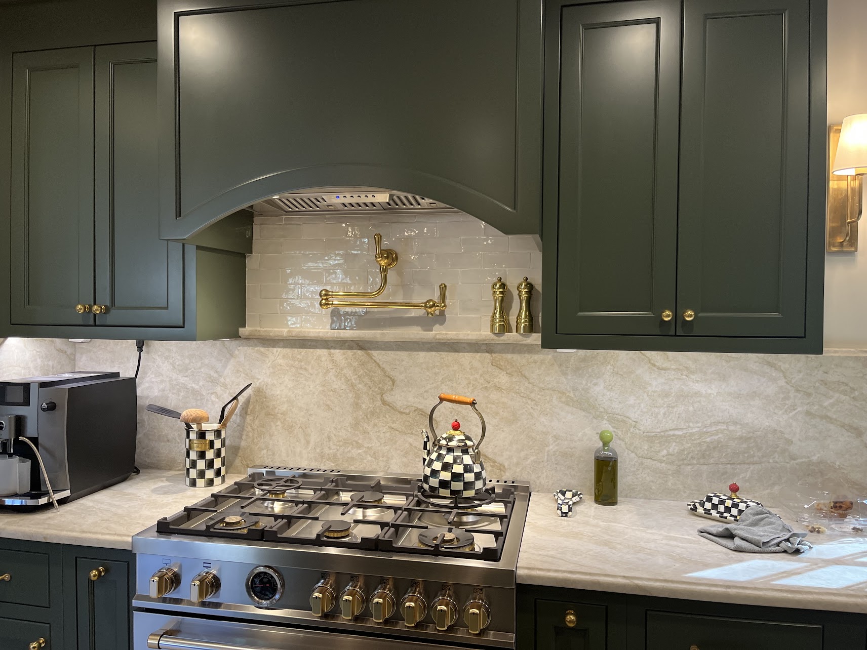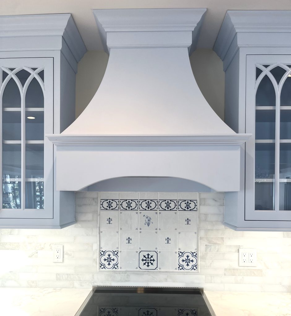 Seaside Elegant in Coastal Blue Backsplash is marble accented with Historic Reproduction of French Provincial Delft tile from Monet’s Garden kitchen, and 17th Century Dutch Delft tile.